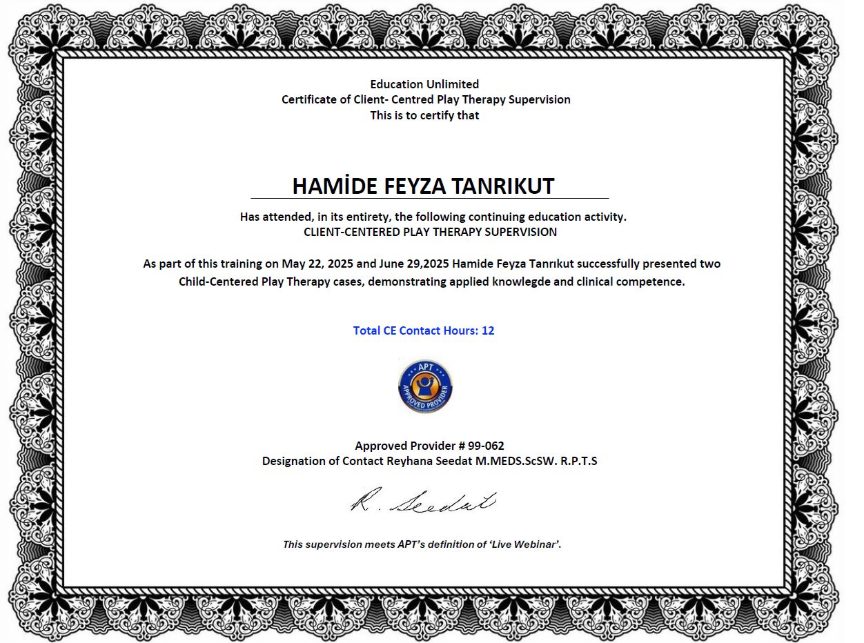Yüksek lisans sürecinde süpervizyonunu Bilişsel Davranışçı Terapi (BDT) üzerine almıştır. Ayrıca, uluslararası akredite Çocuk Merkezli Oyun Terapisi (ÇMOT) ve Filial Terapi eğitimlerini tamamlamış, yetişkinler için Kabul ve Kararlılık Terapisi (ACT) eğitimine devam etmektedir.